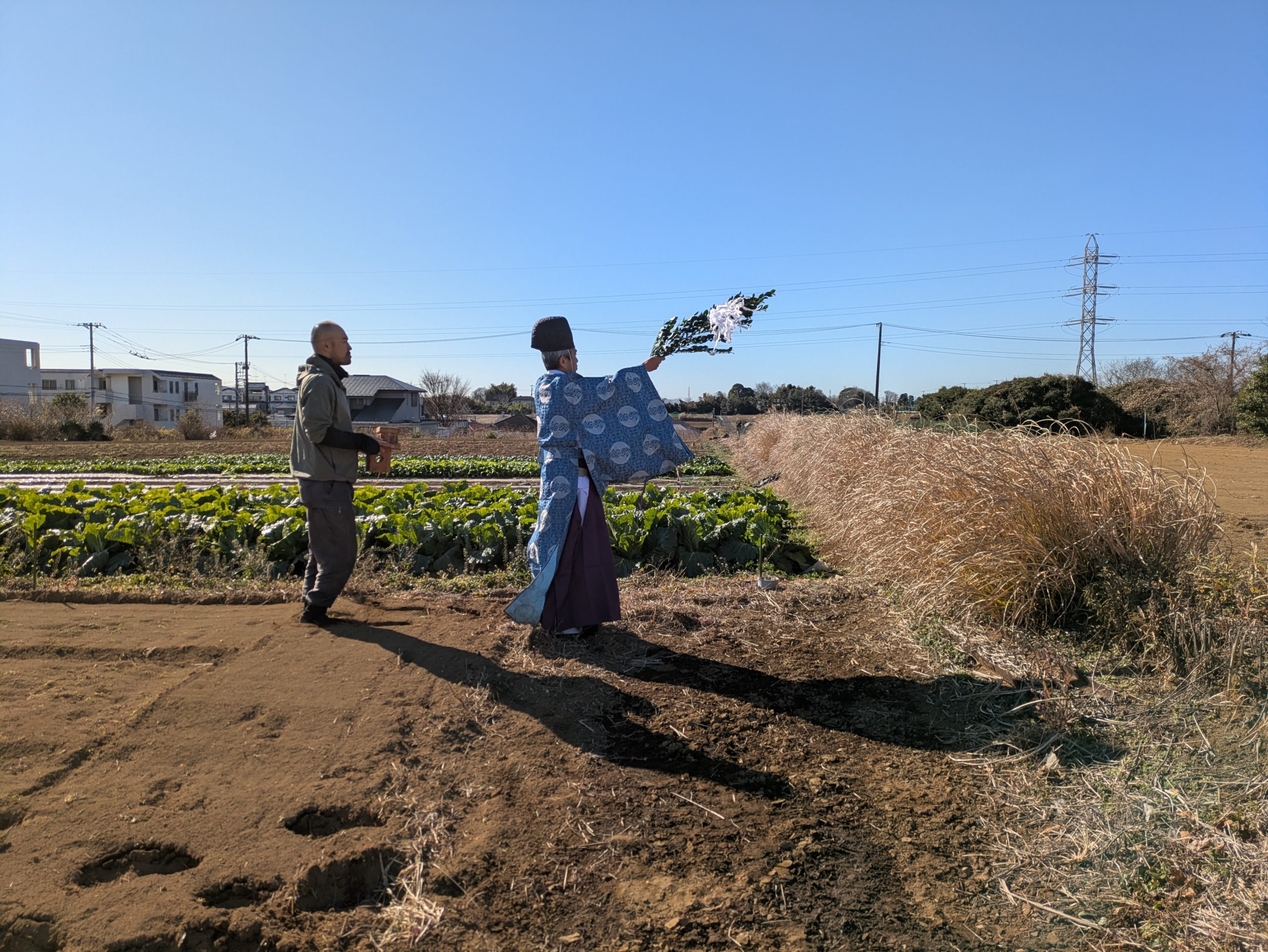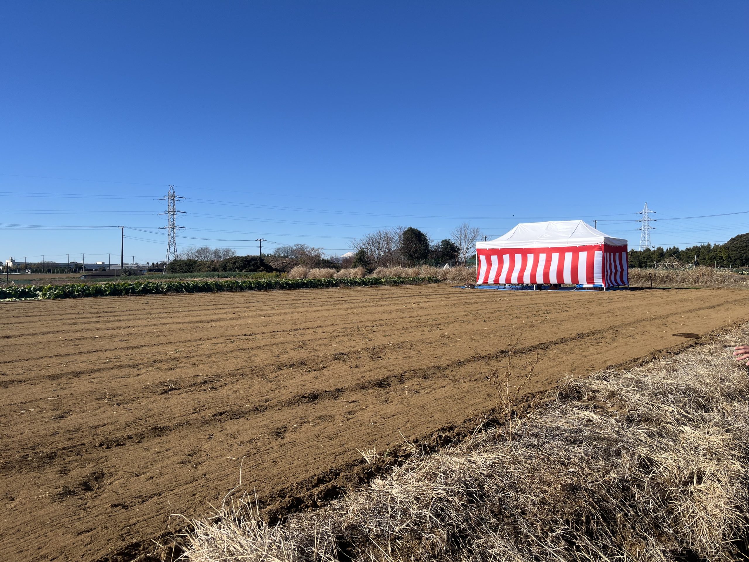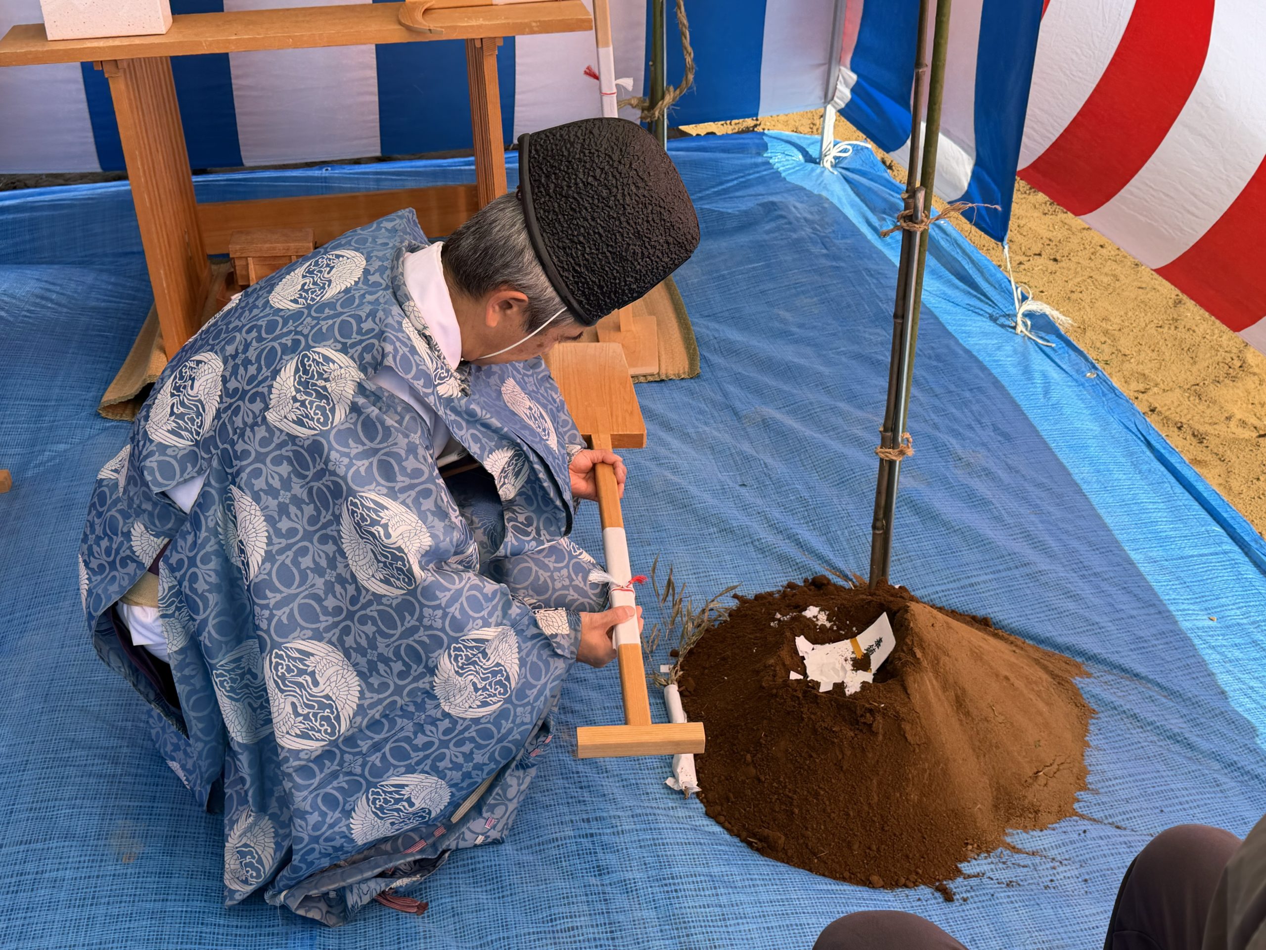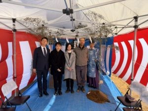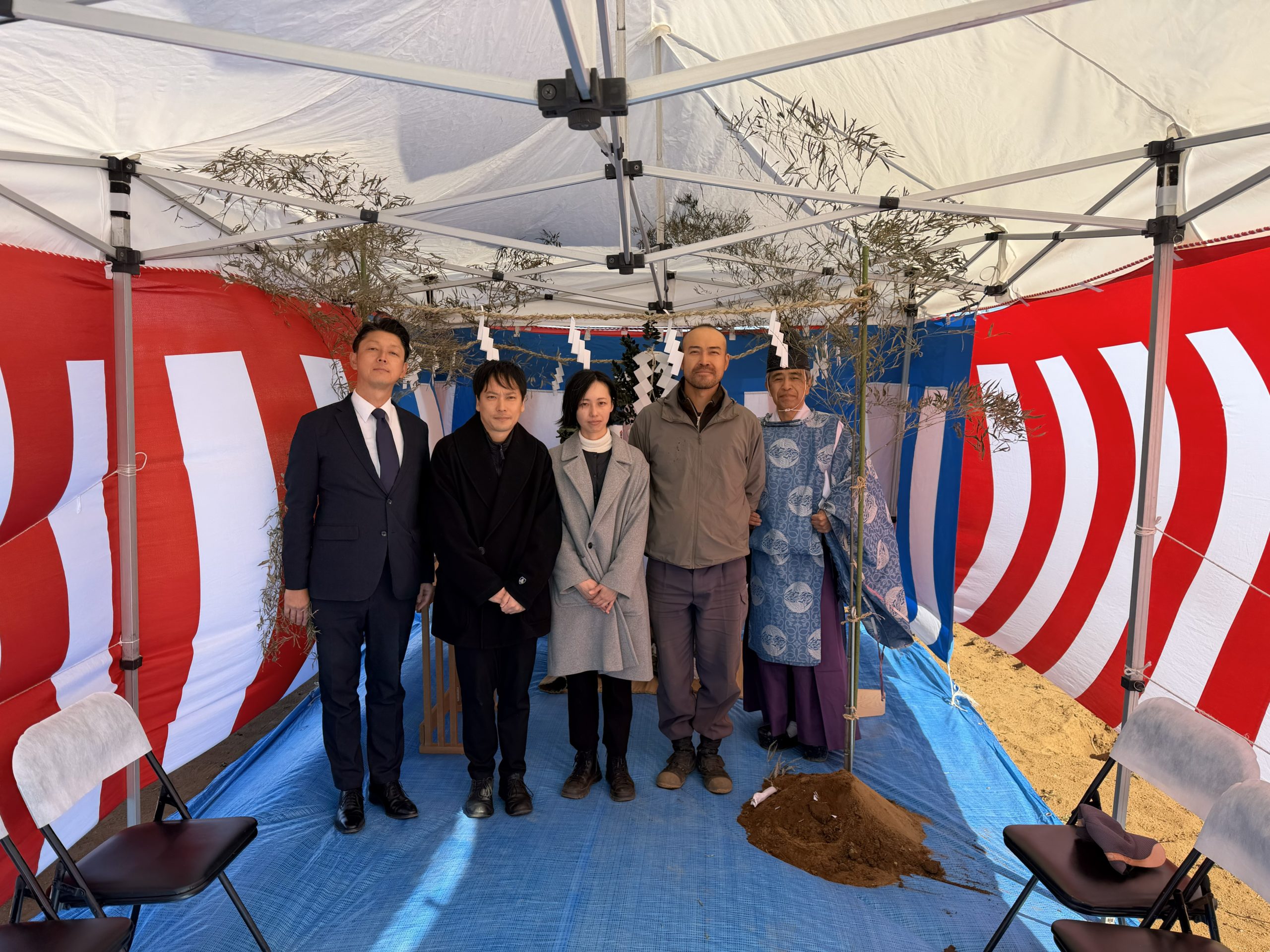 この度、神奈川県横浜市に飲食店建設のご依頼をいただき、建築・設計施工をさせていただくことになりました。2026年1月9日、時折強い風が吹くものの晴天の中、工事の安全や建物の繁栄を祈願し、無事に地鎮祭を執り行うことができました。